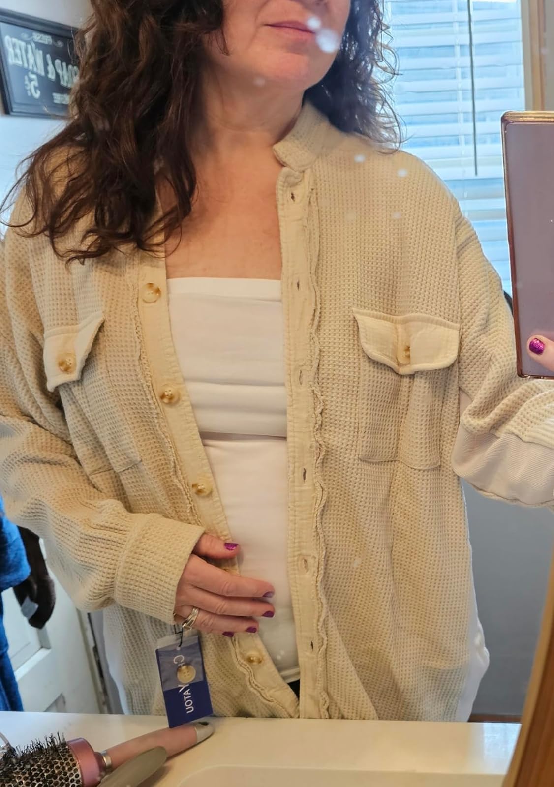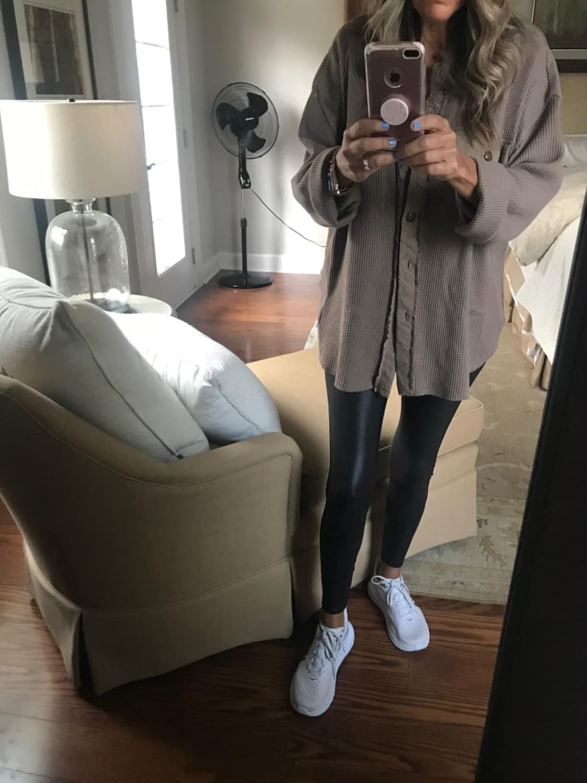 That easy layer you grab when you’re running out the door — soft, lightweight, and perfectly oversized. Works as a top or a light jacket, and somehow makes even leggings look put together.